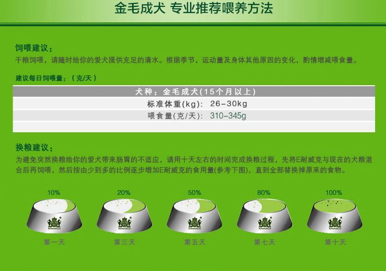干糧飼喂,請隨時給您的愛犬提供充足的清水。根據季節、運動量及身體其他原因的變化,酌情增減喂食量。